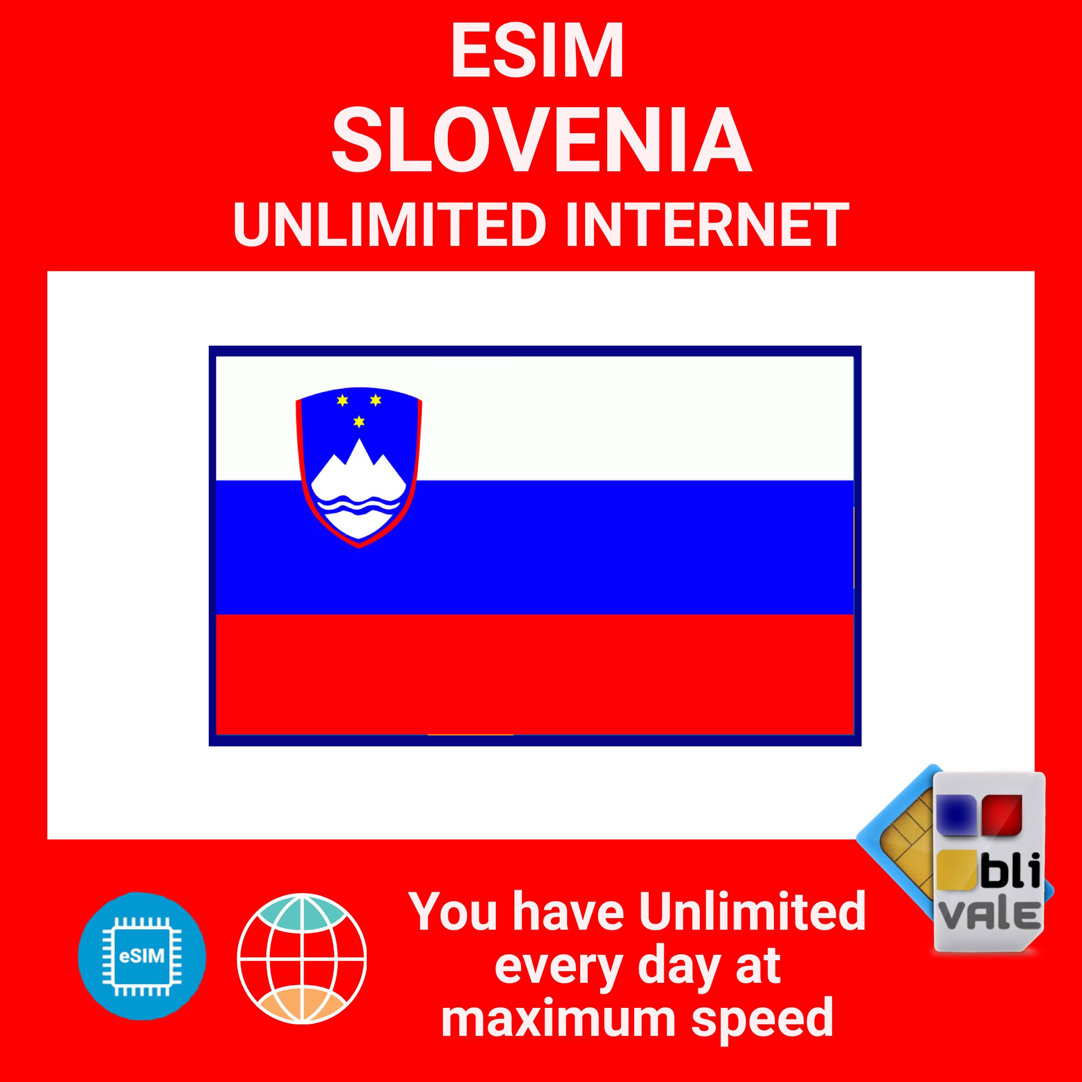 Buy an eSIM for SLOVENIA and enjoy unlimited internet. Get connected in minutes with unlimited data at 4G/LTE/5G speeds and stay connected with your business, colleagues, family, and friends wherever you are. Getting started with our services is easy. After your purchase, you'll receive a personalized QR code via email within 1-4 hours. Scan it with your smartphone camera, install the eSIM, and enjoy fast, stable, unlimited internet. Your SIM activates automatically! Install the eSIM before your trip, put your smartphone in airplane mode during the flight, and reactivate your internet connection upon arrival at your destination. Start browsing and using your apps with the BLIVALE eSIM.