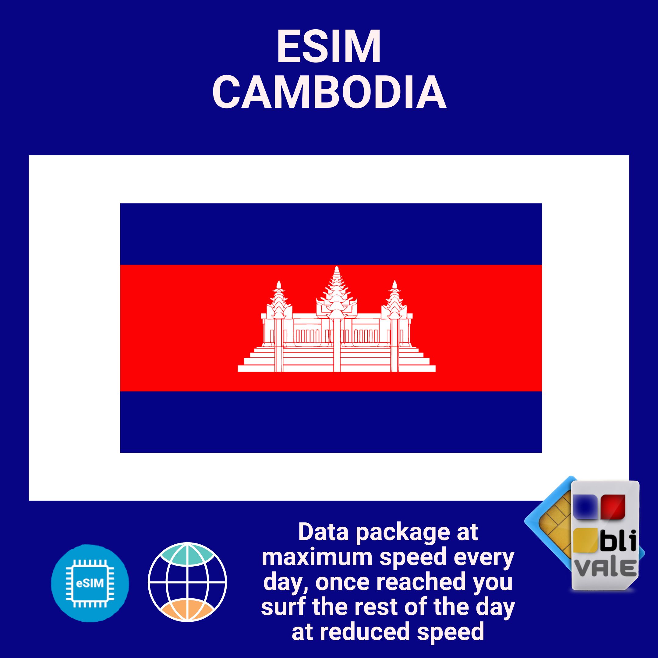 Buy a eSIM eSIM for CAMBODIA (KH) Unlimited, Data package at maximum speed every day, once reached you surf the rest of the day at reduced speed. Connect in minutes with unlimited data at 3G/4G/LTE/5G speed and stay in touch with your company, colleagues, family and friends wherever you are. Getting started with our services is easy. After your purchase, you will receive a personalized QR Code via email within approximately 24/48 hours. Scan it with your smartphone camera, install the eSIM and enjoy a fast and stable Internet connection. Your SIM is Auto Activate! Install the eSIM before the trip, during the flight put your smartphone in airplane mode, and reactivate the internet connection upon arrival in the country of arrival, start browsing and using your APPs with the BLIVALE eSIM.